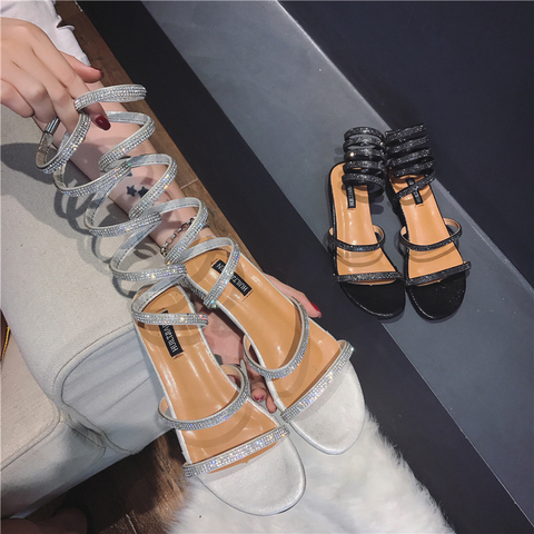 一字扣带粗跟铆钉性感黑色露趾凉鞋