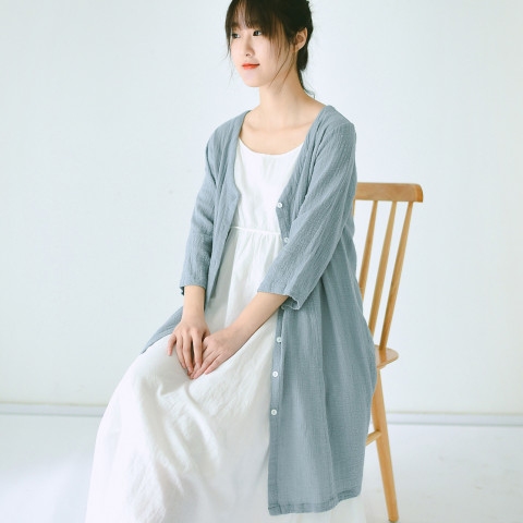 2017新款春款衬衣外套女文艺竹节棉麻纯色中长薄款遮阳衫空调开衫