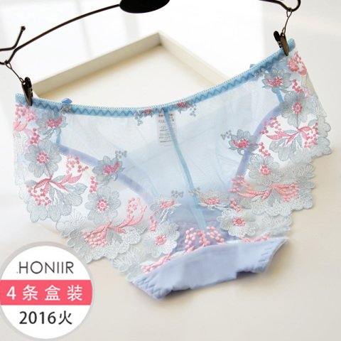 包邮4条装 性感蕾丝网纱内裤女秋刺绣花中腰女士内裤大码纯棉裆