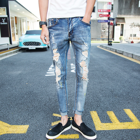 破洞修身九分牛仔裤